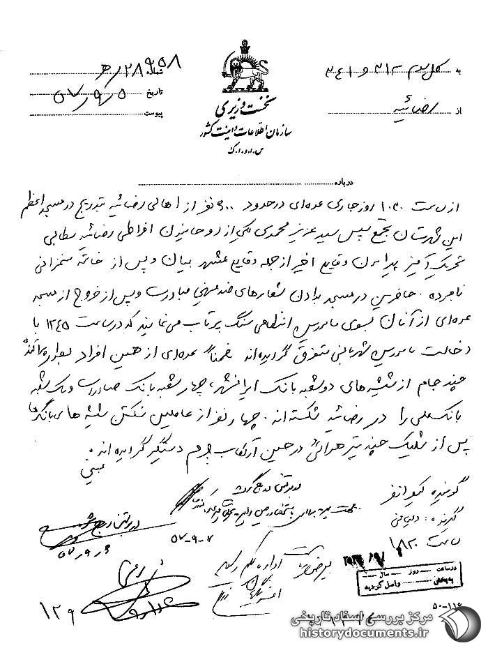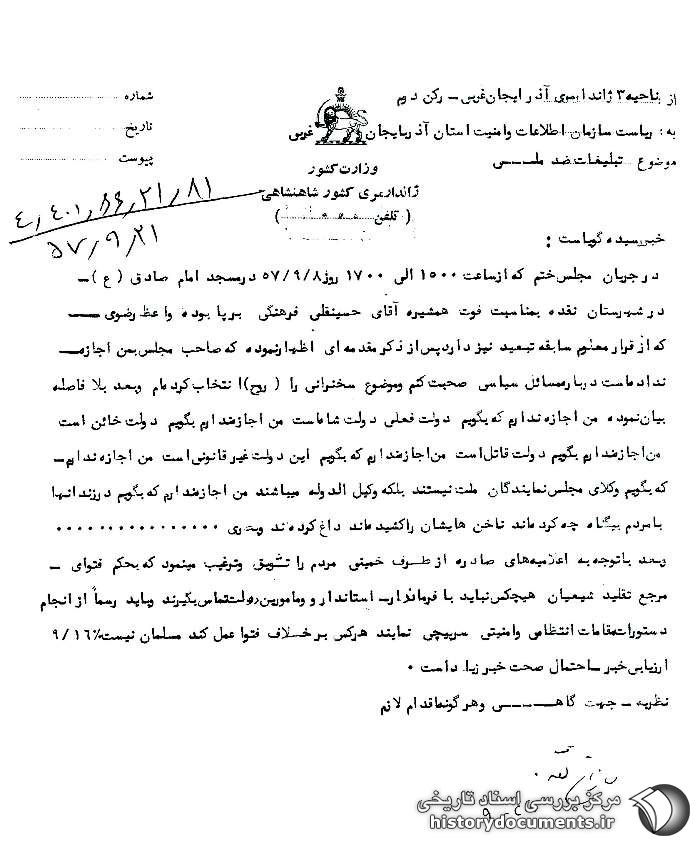 [47]. سند شماره 24، پیوست در همین مقاله. دو روز پس از ایراد این سخنرانی، صبح روز 14 آذر 1357، یکی از مأموران شهربانی ارومیه موقع خروج از منزل هدف حمله چهار نفر ناشناس قرار گرفت و حال وی وخیم گزارش شد. طبق گزارش اسناد وقوع چنین حوادثی سبب تضعیف روحیه پرسنل گردید. همچنین در همین سند آمده است که برخی از «روحانیون مخالف و عناصر افراطی» عدهای را مأمور شناسایی و تعیین آدرس محل سکونت مأموران آگاهی و ساواک نمودند تا در موقعیت مناسبی به اقداماتی در مورد آنان دست بزنند. (مساجد استان آذربایجان غربی به روایت اسناد ساواک، همان، ج 2، ص 134).