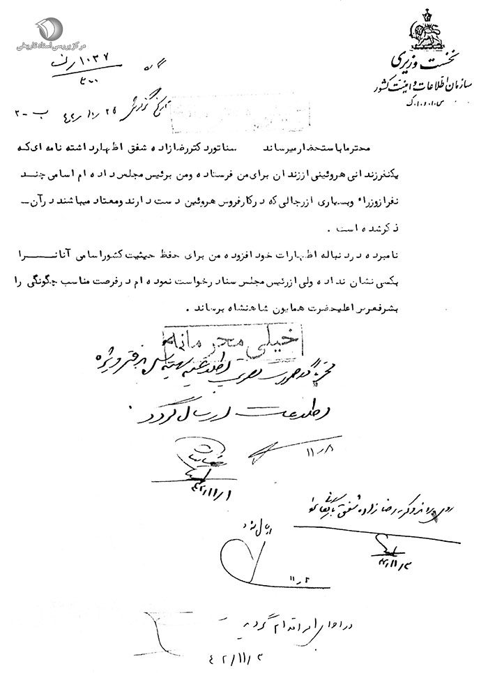 محترماً به استحضار میرساند سناتور دکتر رضازاده شفق اظهار داشته نامهای که یک نفر زندانی هروئینی از زندان برای من فرستاده و من به رئیس مجلس دادهام اسامی چند نفر از وزراء و بسیاری از رجالی که در کار فروش هروئین دست دارندو معتاد میباشند در آن ذکر شده است.