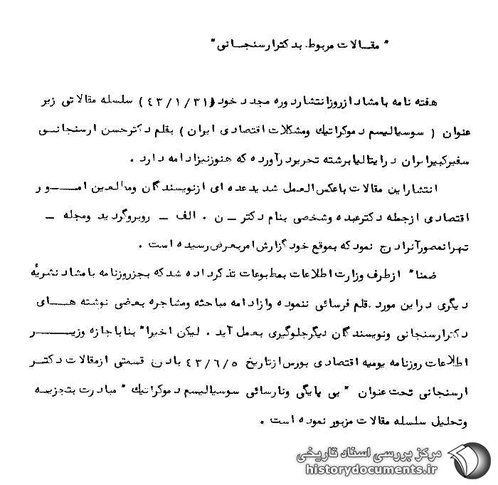 [63]. کابینه حسنعلی منصور به روایت اسناد ساواک، تهران: 1384، مرکز بررسی اسناد تاریخی، ج 2، ص 216.