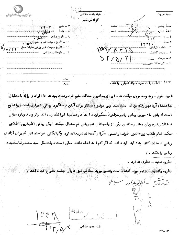 نامبرده فوق در مدرسه مروی میگفت عدهای از روحانیون مخالف مقیم قم درصدد بودند تا افرادی را که به استقبال شاهنشاه آریامهر رفته بودند بشناسند ولی موضوع مهمتر برای آنان دستگیری ربانی شیرازی[1] است زیرا شایع است که وقتی مأمورین ربانی را در منزلش دستگیر کردهاند در همانجا او را کتک زدهاند و از وی درباره میزان دخالتش در جریان به قتل رساندن یکی از پاسبانان شهربانی قم سؤال میکنند لیکن ربانی اظهار بیاطلاعی میکند تمام طلاب و روحانیون طرفدار خمینی مصرّاً از آیتالله شریعتمداری[2] و گلپایگانی[3] خواستهاند که برای آزادی ربانی دخالت کنند و تأکید کردهاند که اگر آنها مداخله نکنند ممکن است دولت مثل سیدمحمدرضا سعیدی[4] ربانی را بکشد.
