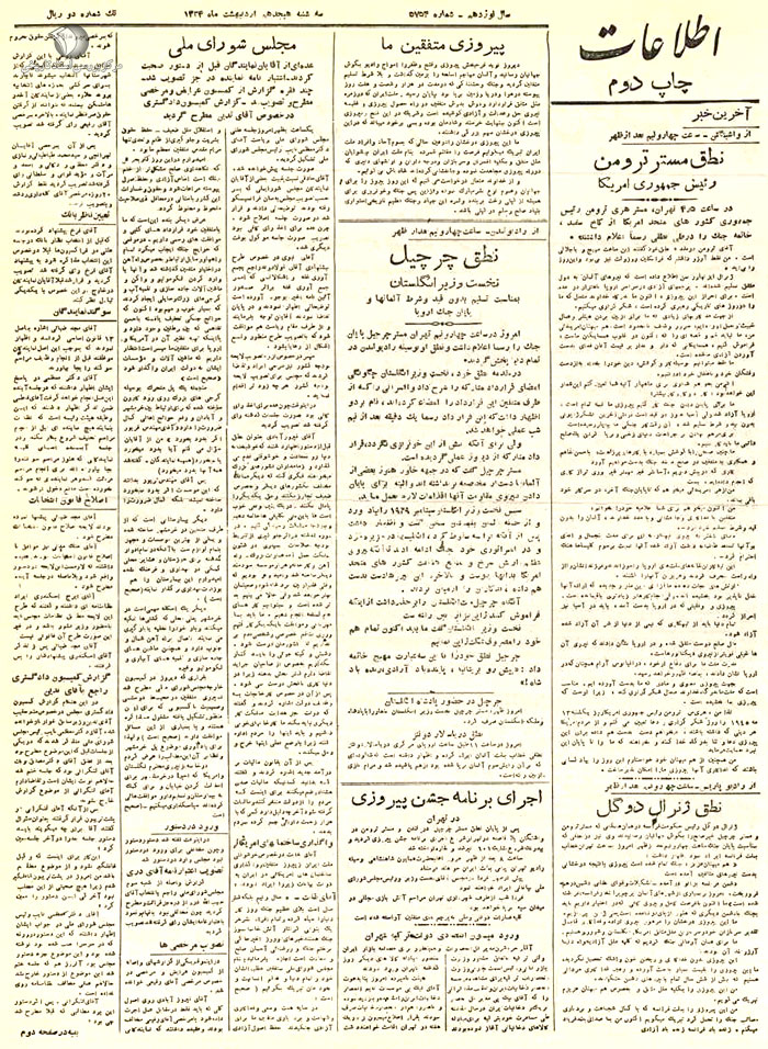 بازتاب خبر پایان جنگ جهانی دوم در روزنامه اطلاعات ـ 18 اردیبهشت 1324