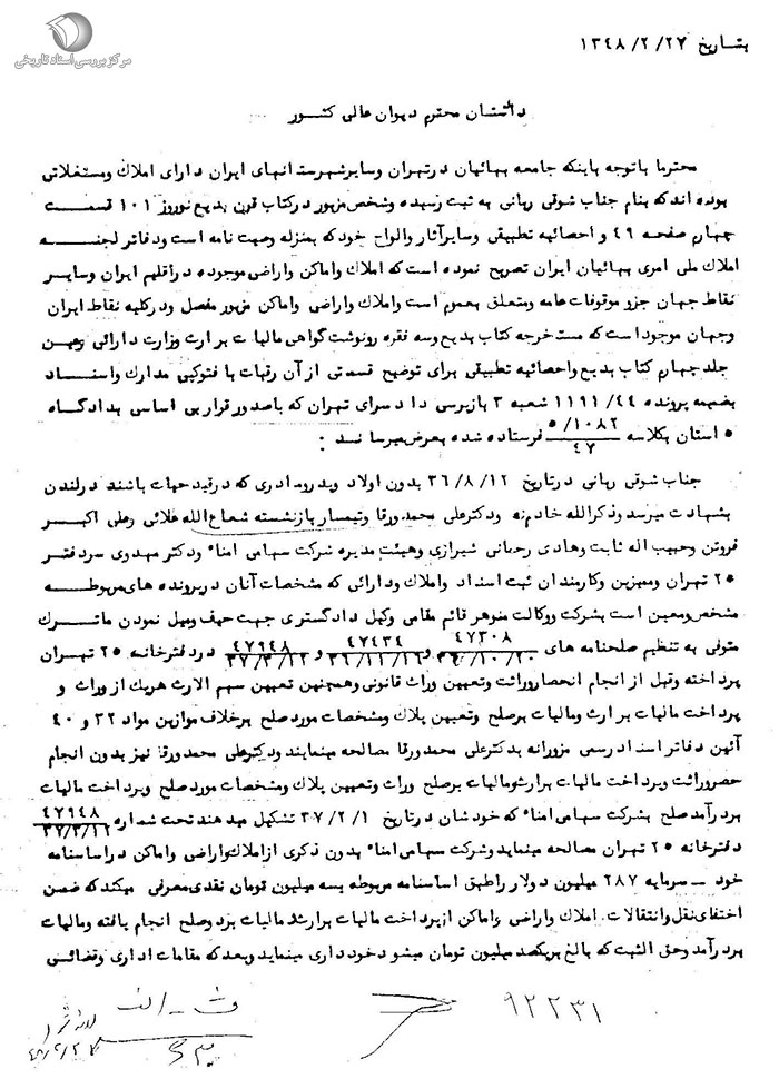 املاک و مستغلات بهائیان در تهران به نام شوقی افندی. صفحه1