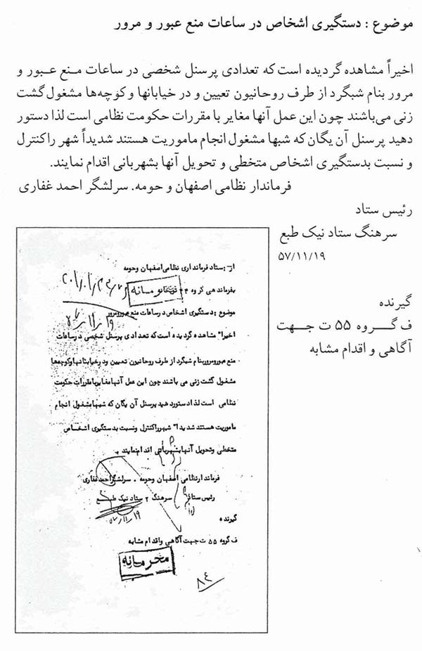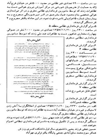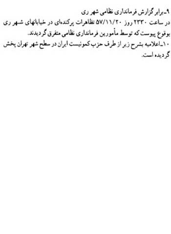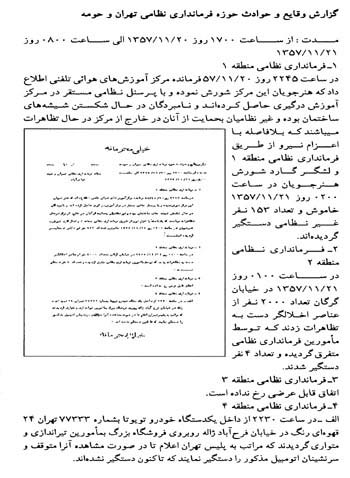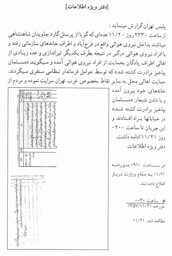 دو سند زیر اوضاع شهرهای تهران، اصفهان و قم را به تصویر کشیدهاند. سند مربوط به فرمانداری نظامی اصفهان و حومه نشان میدهد که انقلابیون میکوشیدند نظم و امنیت را در شهر برقرار کنند. بنابر این گزارش روحانیون انقلابی با گماشتن افرادی مسئولیت نظم و امنیت در شهر را بر عهده گرفته بودند. فرمانداری نظامی این کار را مغایر با مقررات حکومت نظامی میدانست و خواستار برخورد با آنها شده بود. در سند دوم که در دفتر ویژه اطلاعات تولید شده از درگیری چند ساعته نیروهای گارد جاویدان شاهنشاهی با نیروی هوایی در منطقه فرحآباد حکایت میکند. این درگیریها با حمایت مردم از پرسنل نیروی هوایی و مقابله با حملات گارد جاویدان همراه بود. حمایتهای مردمی از نیروی هوایی البته به سایر نقاط غرب تهران نیز گسترش پیدا کرد. با اعلام حمله گارد جاویدان مردم از اطراف تهران خودشان را به پادگان رسانده با حرکت مردم رعب و وحشتی در نیروهای گارد پدید آمد... و این روند همزمان با دفاع و حمایت از دولت موقت به دستور حضرت امام بود. در قم نیز راهپیماییهای مردمی در لبیک به فرمان حضرت امام خمینی(ره) برای تشکیل دولت موقت برپا بود.