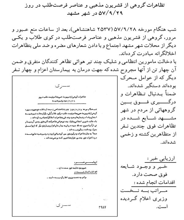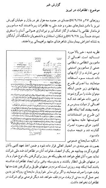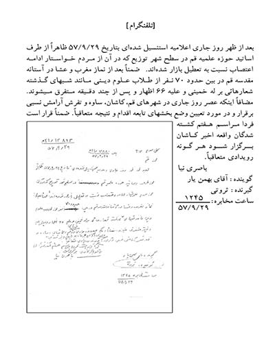 سند زیر گزارشی است از ساواک راجع به انتشار اعلامیه اساتید حوزه علمیه قم با موضوع ادامه اعتصابات در سال 1357. علاوه بر خبر انتشار اعلامیه، اخبار حوادث و تظاهرات برخی شهرها از جمله قم، کاشان، ساوه و تفرش نیز به اختصار ارائه شده است. در بخشی از سند آمده است: «طلاب علوم دینی مانند شبهای گذشته شعارهای بر له خمینی و علیه 66[شاه] اظهار و پس از چند دقیقه متفرق میشوند.»