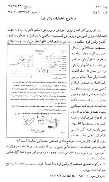 سند زیر به شیوهی مدیریت خانم «فرخ روپارسای» وزیر آموزش و پرورش و از اعضای تشکیلات بهائیت در سال 1348 اشاره دارد. بر اساس این سند وی برخی مشاغل را به فروش میرسانده است. در بخشی از سند میخوانیم: «بعضاً اظهار میدارند که اگر کسی تقاضای شغلی بکند خانم وزیر از او سوال میکند: «وضع مادی شخص جنابعالی چگونه است؟»