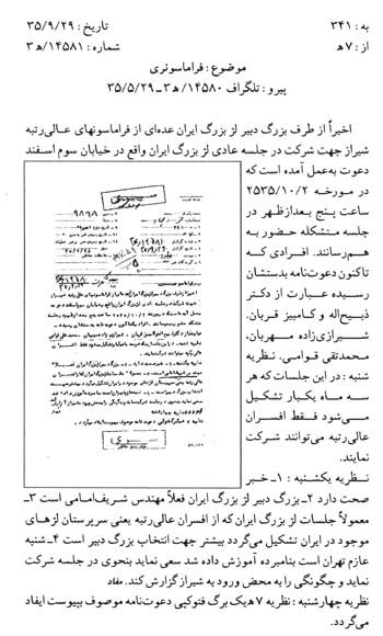 دعوت از فراماسونهای عالیرتبه شیراز برای شرکت در جلسهی عادی «لژ بزرگ ایران» در سال 1355 موضوع سند زیر است. این جلسه برای انتخاب «بزرگ دبیر لژ» بوده است؛ چرا که منبع ساواک در این مورد نوشته است: «معمولاً جلسات لژ بزرگ ایران که از افسران عالیرتبه همین سرپرستان لژهای موجود در ایران تشکیل میگردد بیشتر جهت انتخاب بزرگ دبیر است.» قابل ذکر است که ذبیحالله قربان از اعضای فعال تشکیلات بهائیت در شیراز و همچنین کامبیز قربان در شمار فعالان جریان مزبور بودند.