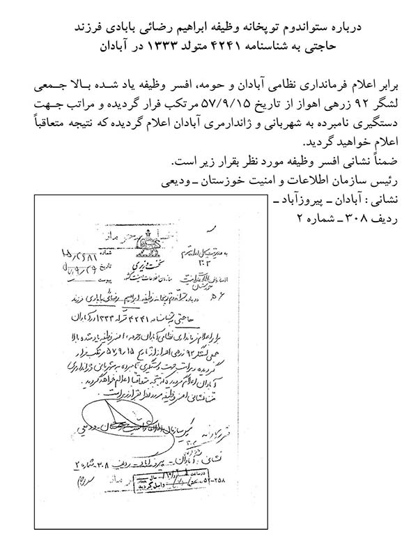 سند زیر نشان میدهد که چگونه ستواندوم توپخانه، جمعی لشکر 92 زرهی اهواز محل خدمت خود را ترک کرده است. اقدامات مشابهی در راستای لبیک به دعوت حضرت امام در نقاط مختلف کشور اتفاق افتاده است که برخی از آنها در گزارشهای مأمورین حکومتی، فرمانداری نظامی و مأمورین ساواک بازتاب یافته است. سند زیر گزارشی است از یکی از این موقعیتها.